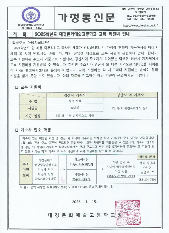![]() 안녕하십니까 대경문화예술고등학교입니다. 신입생 대상으로 교복 지원비 관련하여 가정통신문을 안내드리고자 합니다. 확인하시고 문의사항 있으신 분은 학생생활 안전부(053-850-1195)로 연락주시면 됩니다. |