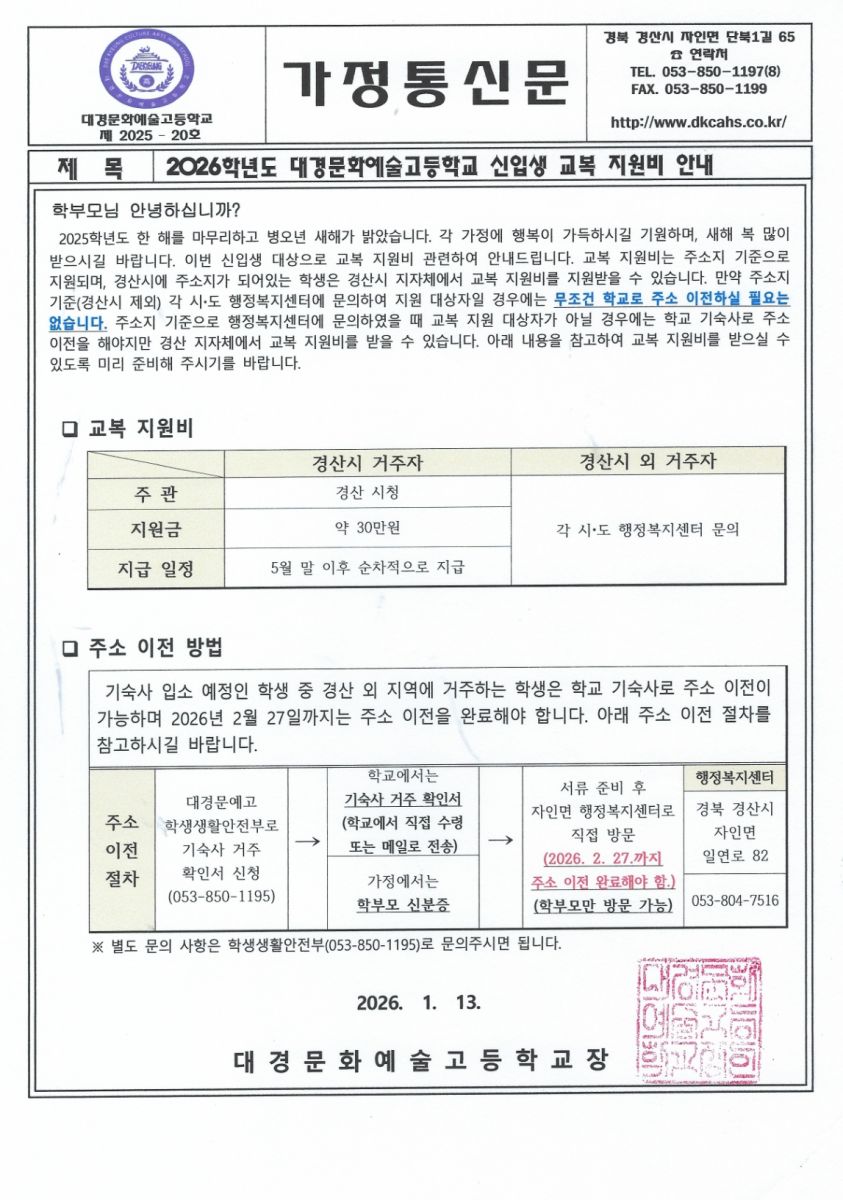 2026학년도 대경문화예술고등학교 신입생 교복 지원비 안내 가정통신문