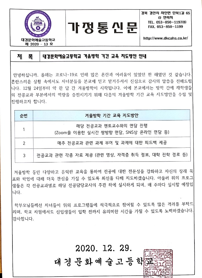 대경문화예술고등학교 겨울방학 기간 교육 지도방안 안내 - 재학생