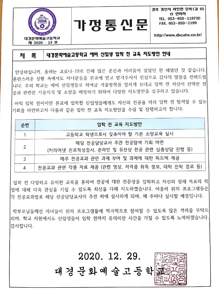 대경문화예술고등학교 겨울방학 기간 예비 신입생 교육 지도방안 안내