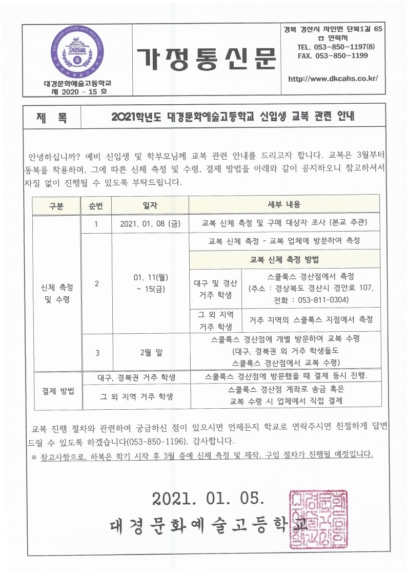 2021학년도 대경문화예술고등학교 예비 신입생 교복 관련 안내