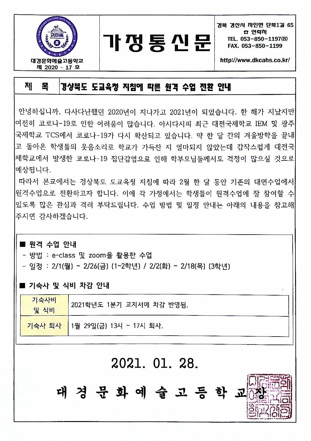 | 다음글 | 2021학년도 대경문화예술고등학교 학생생활규정 가정통신문 |