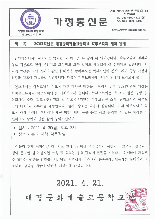 2021학년도 대경문화예술고등학교 학부모회의 개최 안내
