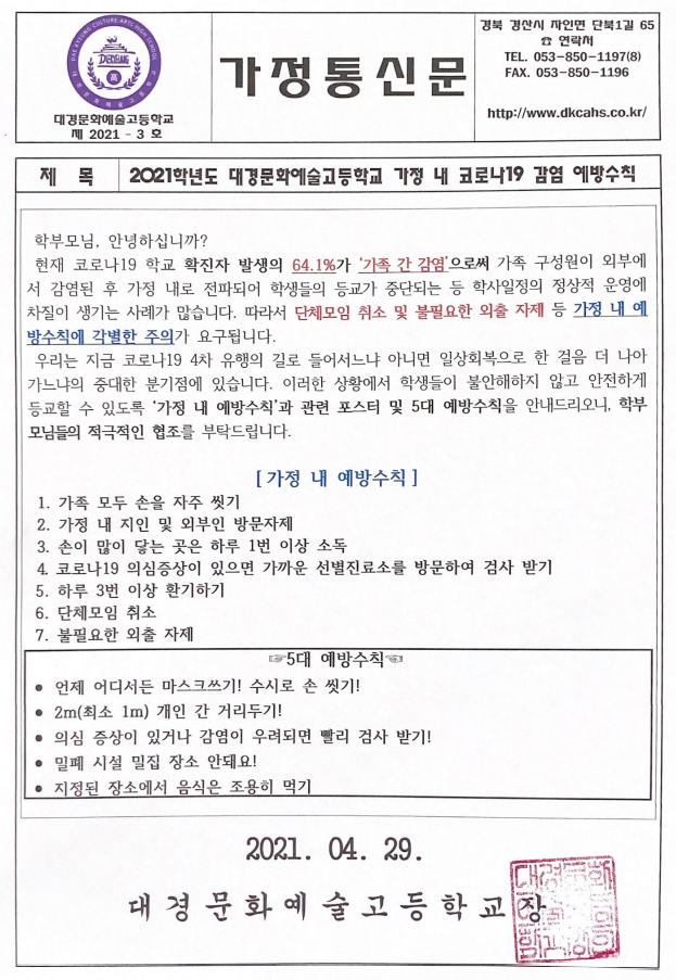 2021학년도 대경문화예술고등학교 가정 내 코로나19 감염 예방수칙