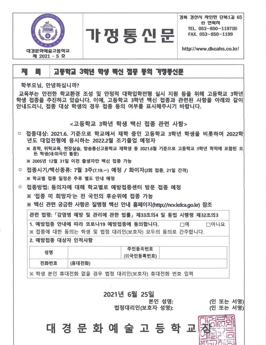 | 다음글 | 2021학년도 대경문화예술고등학교 고등학교 3학년 백신 접종 시행방안 |