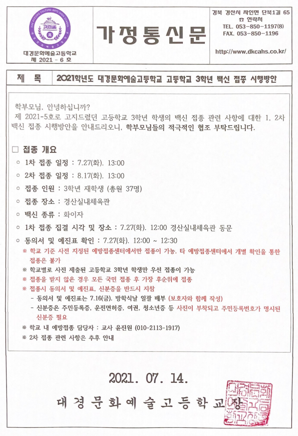 2021학년도 대경문화예술고등학교 고등학교 3학년 백신 접종 시행방안