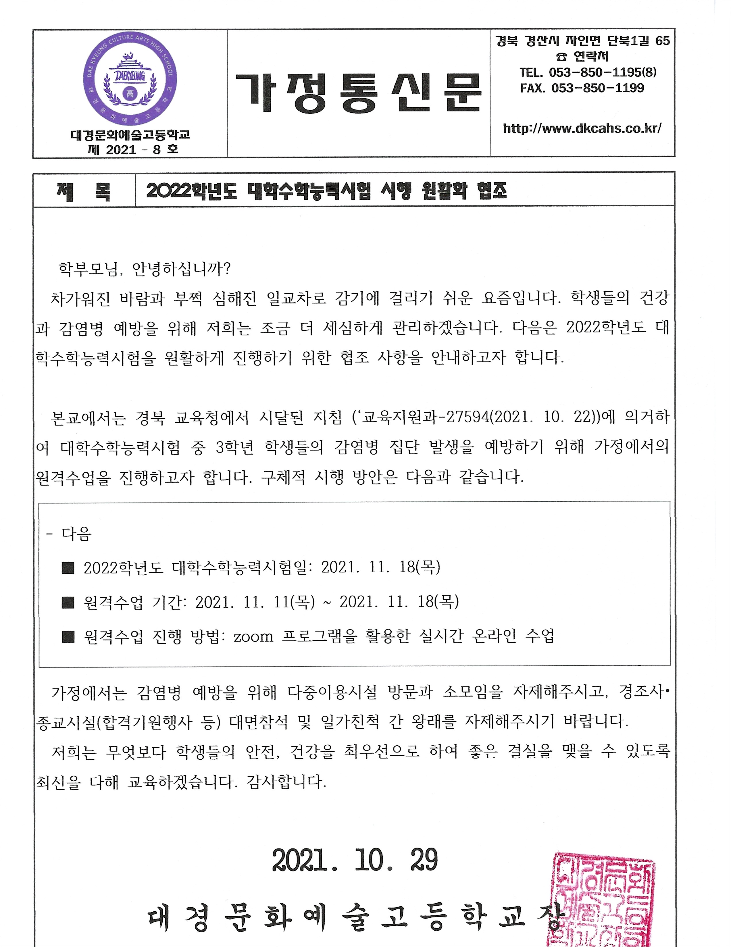 2022학년도 대학수학능력시험 시행관련 가정통신문