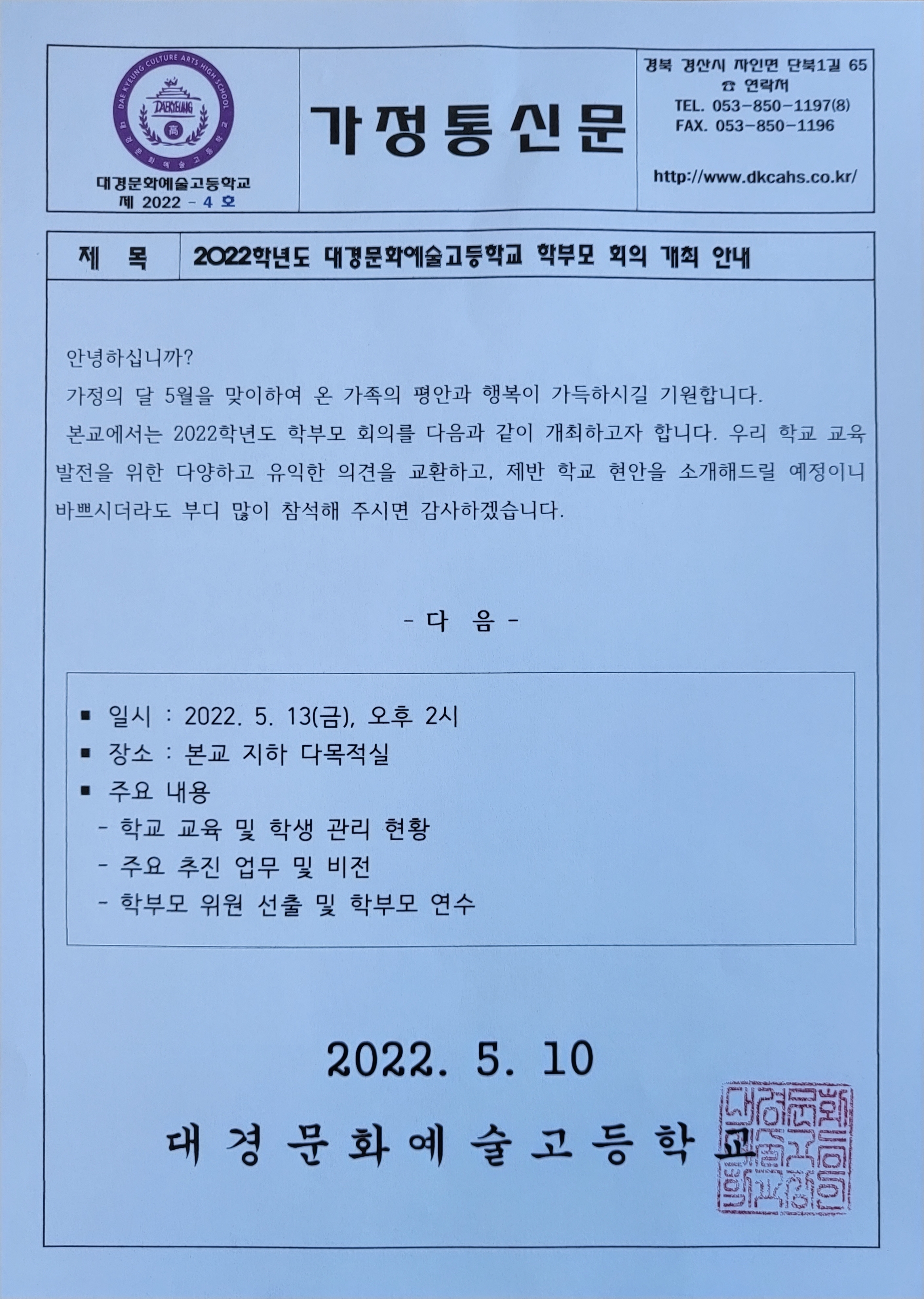 2022학년도 대경문화예술고등학교 학부모회의 가정통신문