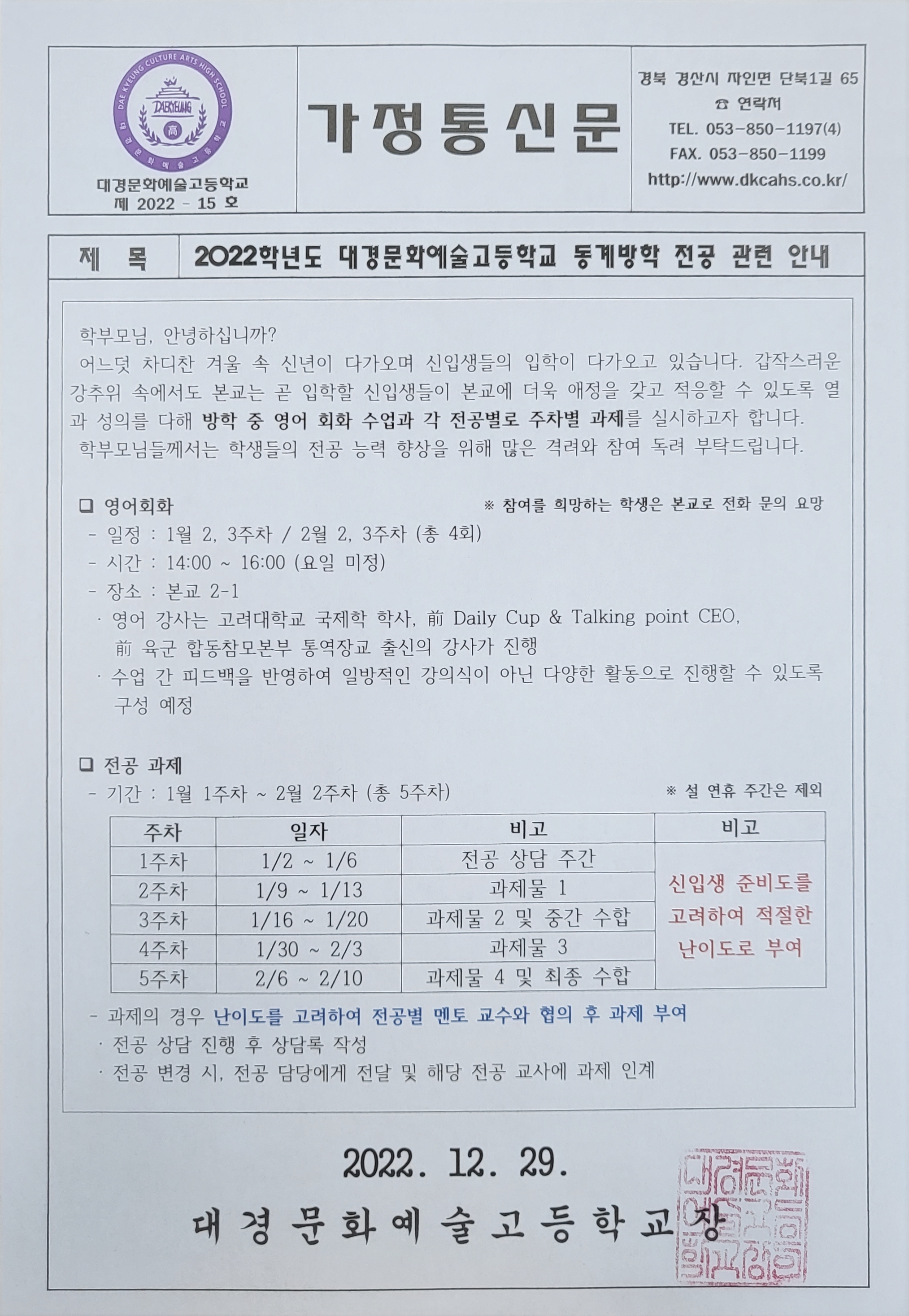 2022학년도 대경문화예술고등학교 동계방학 전공 관련 안내(신입생)