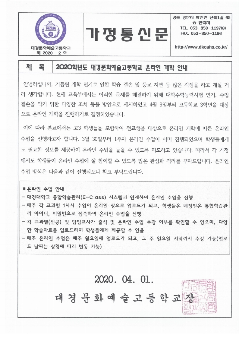 2020학년도 대경문화예술고등학교 온라인 개학 안내