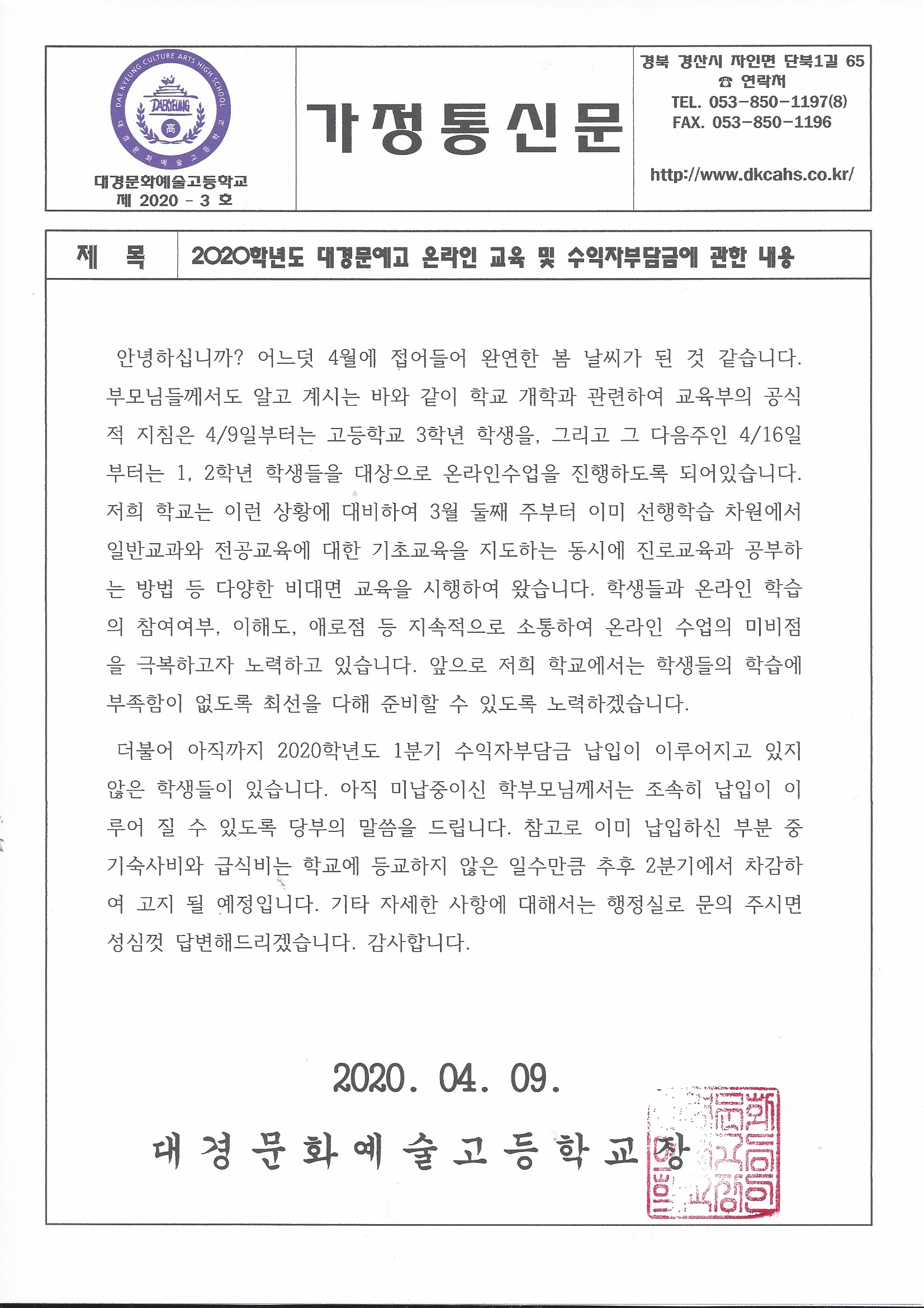 2020학년도 대경문화예술고등학교 온라인 교육 및 수익자부담금에 관한 내용