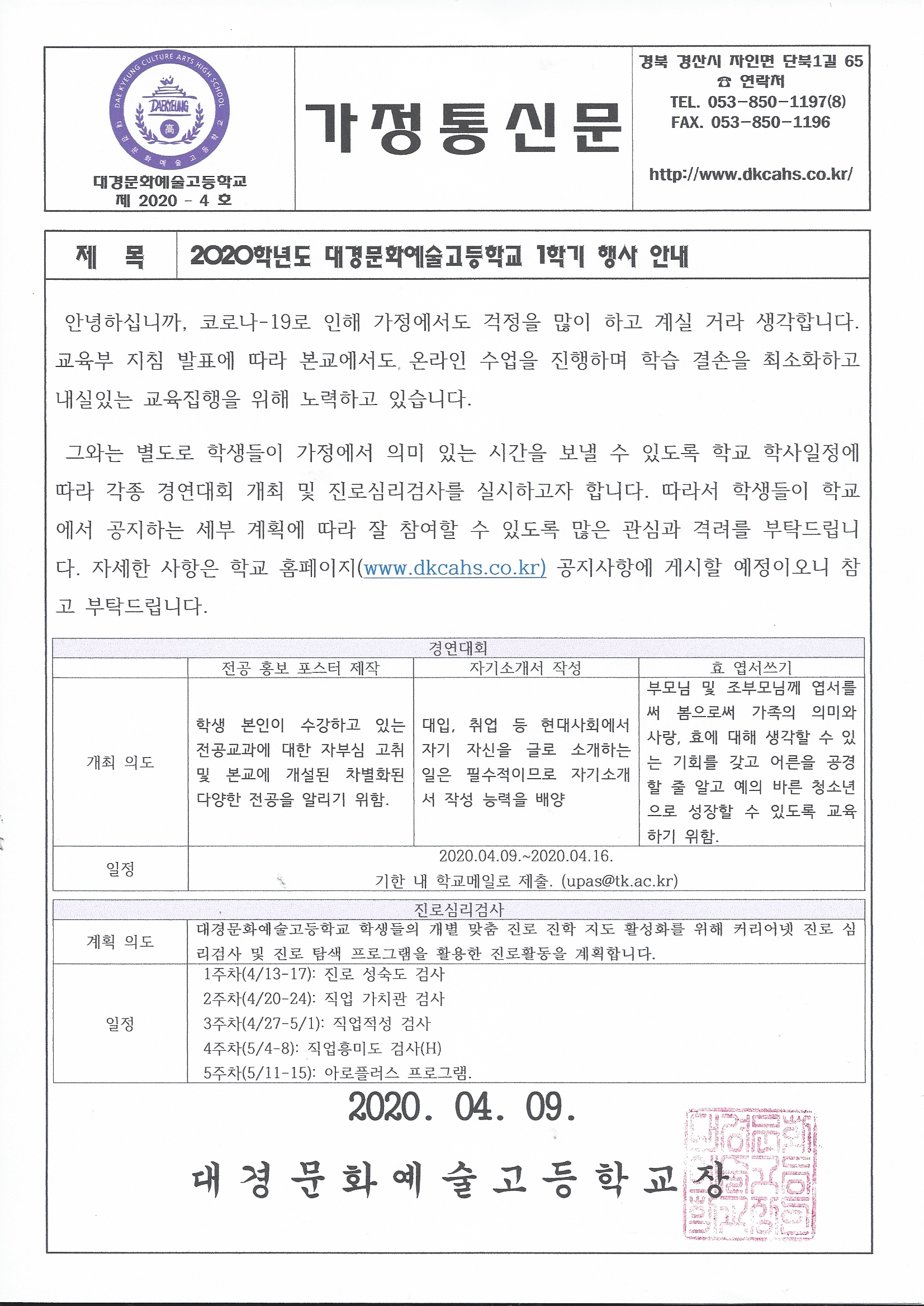 2020학년도 대경문화예술고등학교 1학기 행사 안내